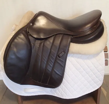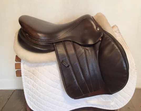 17.5″ Forestier by Voltaire Seoul Saddle 2019 model Full Buffalo 4A Flaps measuring 14.75″ from stirrup bar to bottom and 14.5″ across 5.25″ dot to dot tree measurement Integrated Pro Panels Beautiful espresso brown