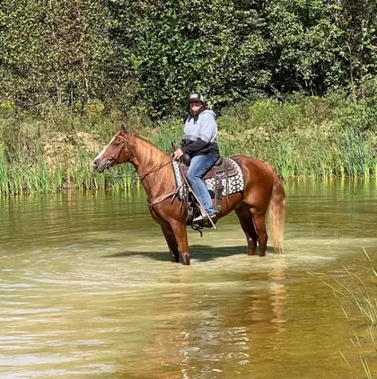 horse his whole life and been hauled all over. Let me tell you it shows. He will climb up anything and tip toe right back down the other side. He crosses all types of water, fallen trees and slippery rocks. He is gun safe and has been used to handle hunting dogs off of him. He is very confident and willing you can seriously do anything with him. He has been in parades, been to field trials, horse shows and etc. You name it he has probably done it