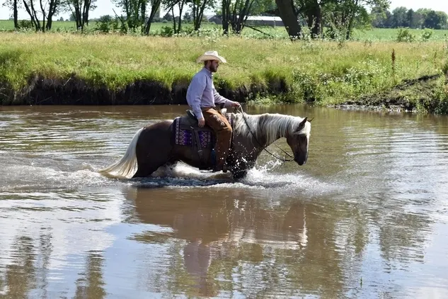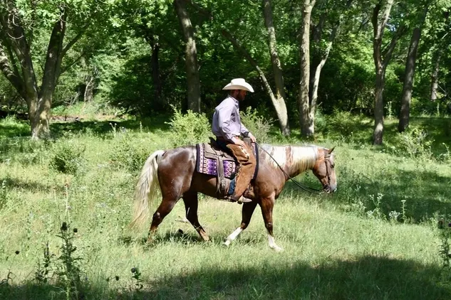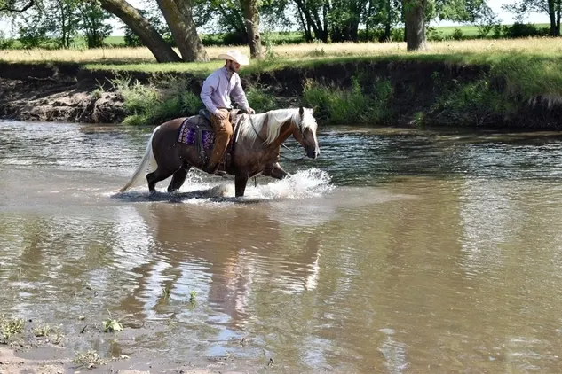 Talk about the coolest colored palomino gelding around!!! Pokey is a chocolate palomino with a white mane and tail and plenty of chrome! He stands 15.2hh, with a big foot and bone to go along with his full bodied physique. Pokey is a horse that greets you at the gate every time that he sees you and is willing to wait for your attention. Pokey has been used extensively on the trails and been on overnight camping trips in several states and at numerous state parks. He is confident when ridden alone or is happy anywhere in a group whether he leads or follows. He is sure footed and has a nice ranch walk where he covers ground effortlessly. He has a smooth trot and his lope is like setting in a rocking chair. Pokey is ready to go in any direction that you want from ranch to trail and will ride quiet and gentle in sunshine or through hail. Call Shane at 940-765-7177 with any questions. Located in Sheffield, IA.