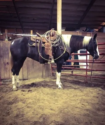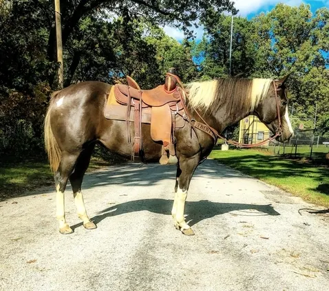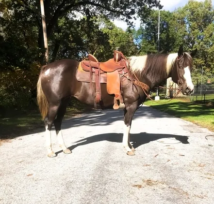Pocos Lacey Bonbon affectionately known as “Little Debbie” is a registered 11 year old chestnut and white paint mare. Little Debbie is standing 15.0 on the stick and weighing a little over 1100 lbs. Little Debbie has been trail ridden all over the country, Indiana, Kentucky, Ohio and Illinois. Little Debbie has been ridden for miles on the trails, she goes up and down rough rocky terrain with every step being very sure footed. She will go through any creek you can find even if she had to swim. She crosses logs, mud holes, fallen trees etc. We have used Little Debbie for all aspects of ranching. Little Debbie rides just as good in the arena as the trails. She has a nice ranch walk, trot and a canter as smooth as if you were in a rocking chair. She would excel in any local 4-H club or carry someone all day long on any trail across the country. Little Debbie stands to be bathed, clipped, groomed, saddled mounted and dismounted and is a farriers best friend. You can catch her anywhere in the pasture and she also is very tidy in a stall. Little Debbie is 100% sound with no bad habits or vices. Absolutely no nonsense with her at all. She is the same every time you step on her. Call Clay 574-780-8378 with any questions or come see her in person in Walkerton, IN.