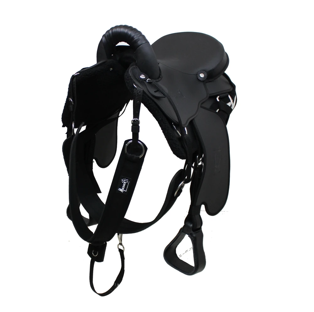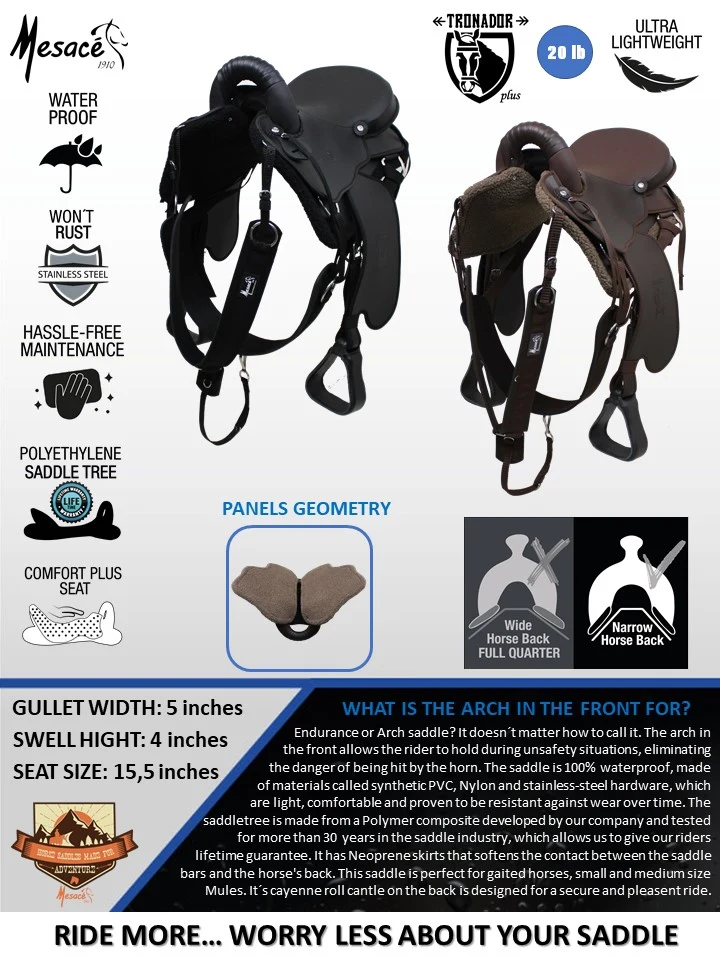 Endurance or Arch saddle? It doesn´t matter how to call it. The arch in the front allows the rider to hold during unsafety situations, eliminating the danger of being hit by the horn. The saddle is 100% waterproof and made of materials called synthetic PVC, Nylon, and stainless-steel hardware, which is light, comfortable, and proven to be resistant to wear over time. The saddletree is made from a Polymer composite developed by our company and tested for more than 30 years in the Endurance saddle industry, which allows us to give our riders a lifetime guarantee. It has Neoprene skirts that soften the contact between the saddle bars and the horse's back. This saddle is perfect for gaited horses, small and medium-size Mules. Its cayenne roll cantle on the back is designed for a secure and pleasant ride.