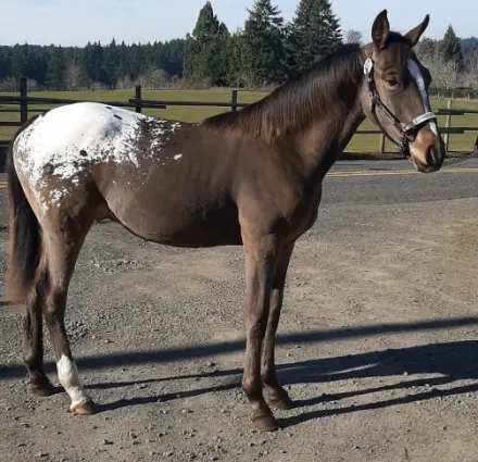 Yearling colt, bay with blanket and spots. Just a bit of chrome. Gaited bloodline from dam side and World Champion bloodlines on Sire side. Looks to mature at 15.2-16h. At 10 months he sticks at 13.3h.. Best of both worlds with TWH disposition and Appaloosa color.