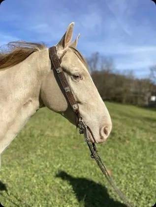 Clyde is a handsome champagne with white stockings on all four legs and a beautiful blaze face. He is 5 Years old and stands 15.2 Hands tall. Clyde is a trail horse deluxe and has