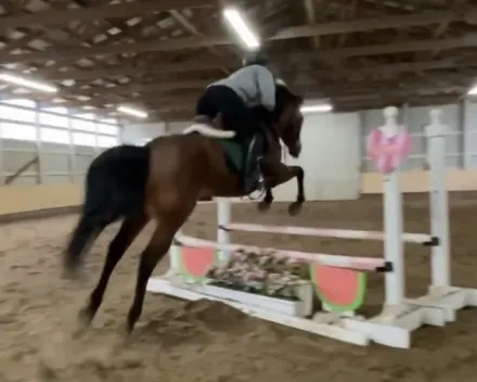 Darcy is a 5yr old grade quarter pony. She has a great brain and really just wants to be a little girl or boys best friend. Darcy can walk, trot, canter and has been started over small fences and shows she is brave. She is the same ride regardless of indoor, outdoor, or field with other horses or alone