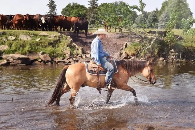 Well Dun Cat aka Dunny is a 11 year old Dun gelding with a dorsel stripe and tiger stripes on his legs. He is a stout built 14.3hh gelding that is a registered Quarter Horse that is an own son of the all time leading cutting horse sire, HIGH BROW CAT whose offspring have earned over $86 million dollars to date. On the dam side he is no slouch there either with Dual Pep and Colonel Freckles to name a couple. Dunny was a finished cutting horse but was never shown, due to no fault of his own. He has pasture roped and doctored cattle, branded calves, help start yearlings and just about every other ranch chore that you can think of. Dunny is safe and gentle and always cinches up and ride off with no issues! He would do well as a sorting horse and is a fantastic on trail that anyone will enjoy! He crosses water, downed timber, goes over rough rocky areas, deep mud and steep slopes don't phase him. He is traffic safe, safe around ranch equipment and safe around all types of wild life. He has been a horse that every member of the family has ridden from myself all the way down to my younger grandkids, Dunny is a horse that you can trust, day in and day out will always be the same for any level of rider. Call Shane at 940-765-7177 with any questions. Located in Bondurant, IA.