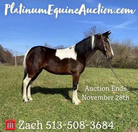 Place your bid at PlatinumEquineAuction dot com Auction ends November 28th $3500 Starting bid Pebbles is a beautiful bay and white grade spotted saddle mare that is 5 years and stands 15 hands tall. Pebbles is a very well broke little mare that is sm...