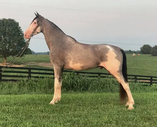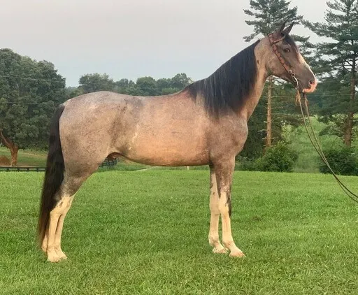RC is a nine year old gelding. This gorgeous guy stands 16.1 and a half inches tall and has the wow features that gets everyone’s attention! RC is a beautiful blue roan color and has the most unique white markings that definitely stand out to everyone’s eye. This boy has been all over the surrounding states on numerous trail rides and camping trips. His previous owners had driven him to a buggy. It’s safe to say he has seen it all. Don’t let his size fool you this horse will go anywhere you point him and handle any terrain or different environments that you ask him to go through. He is a big boy that can pack you any distance you want to go. RC has a very nice enjoyable smooth gait. At anytime you simply pull back and he’ll walk on a loose rein. No pulling your arms off or tricks to get him to gait! He’s all natural. Also as you see in the video RC will canter. We have also been working on side passing and leg cues. He’s a quick learner and has that willing to please attitude.