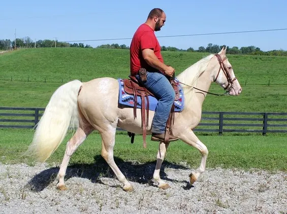 Sabota is a Stocky Built, 15hh, 12 year old, Palomino Sabino Roan Gelding!!! He is a registered Tennessee Walking Horse and has a good pedigree. We have owned Sabota since last winter and he has been one of our personal horses. We have had him trail riding and camping and have took him to several different fun shows though the spring and summer. Sabota neckreins, backs, has a very smooth gait and he will flatfoot walk on a loose rein, when asked he moves out easily as well. Sabota is safe for most beginners to ride. He has had 2 months of professional gaiting, trail and bombproof training. He has been ridden around farm equipment, ATV’s, over large noisy tarps and has also had guns shot off of his back. Just like everything we say about our horses, we have the videos to prove it, make sure to take a look at those on our website. No matter where he goes or what he does, Sabota is not spooky acting. On the trails he is always great! He has been exposed to all kinds of wildlife such as deer or turkey or other animals like cows or dogs and will go anywhere that he is asked too. He has been rode many miles in the mountains of Eastern Kentucky and encountered every obstacle possible on the trail. He will go up or down even the steepest slopes, across deep creeks, over downed trees, and over all types of rough terrain while still being sure footed. He has been rode in traffic, and is very traffic safe around cars, semi, log, and dump trucks. He has a great personality and a great attitude about whatever he is asked to do. Sabota is one of a kind!!! Feel free to call me with any questions.
