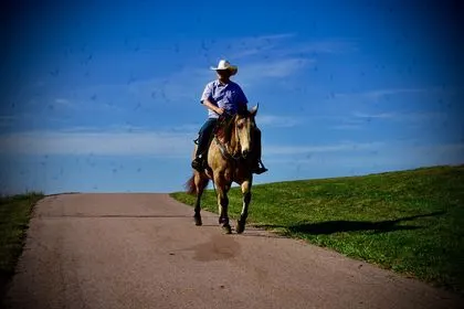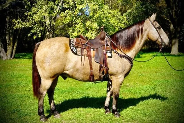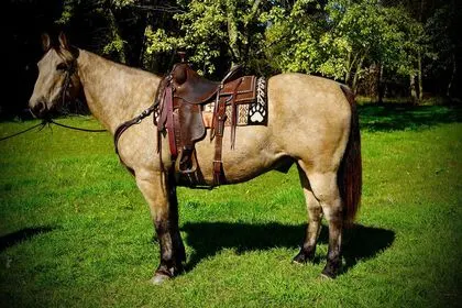 Buckaroo is a gorgeous 15.2 hand 10-year-old buckskin gelding that is built like a Mack truck he is a stocky is the come big bone wears a size 2 shoe, But don’t let his size for you he is very athletic walk trot lopes around nice he is a extremely good ranch horse, he has done all tasks from the Branding pen, pasture roping, sorting pears and much more this gelding is plum gentle for anybody to ride. Buckaroo has been used for tons of trail rides overnight camping trips and around the farm for fun, Rides down the ditches great traffic safe, cross is water goes through anything he is asked, he is levelheaded and easy to ride, he rides out alone or with a group good, good to catch, good to trim and shoe, load and unload good and halls good, good with other horses. Call Pam 605-838-7124 with any questions. Located in Valley Springs, SD.