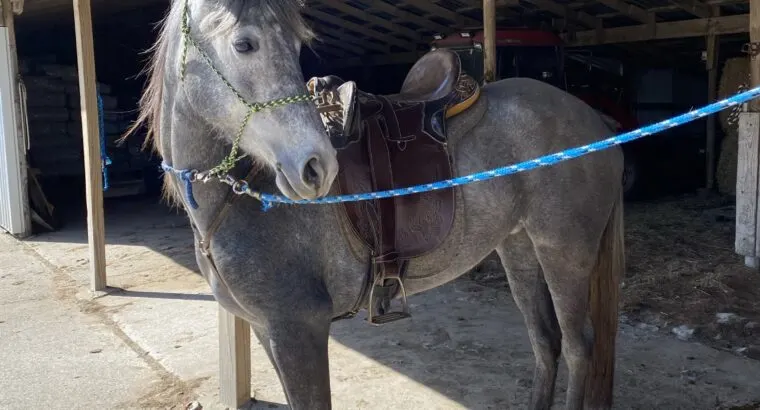 Beautiful dapple gray mare, excellent ground manners – stands very well for the vet or the farrier Super easy to catch, she will come running to you at the gate. Started on trail riding late last fall. Is a little anxious on the trails so she needs an experienced writer to help her with her